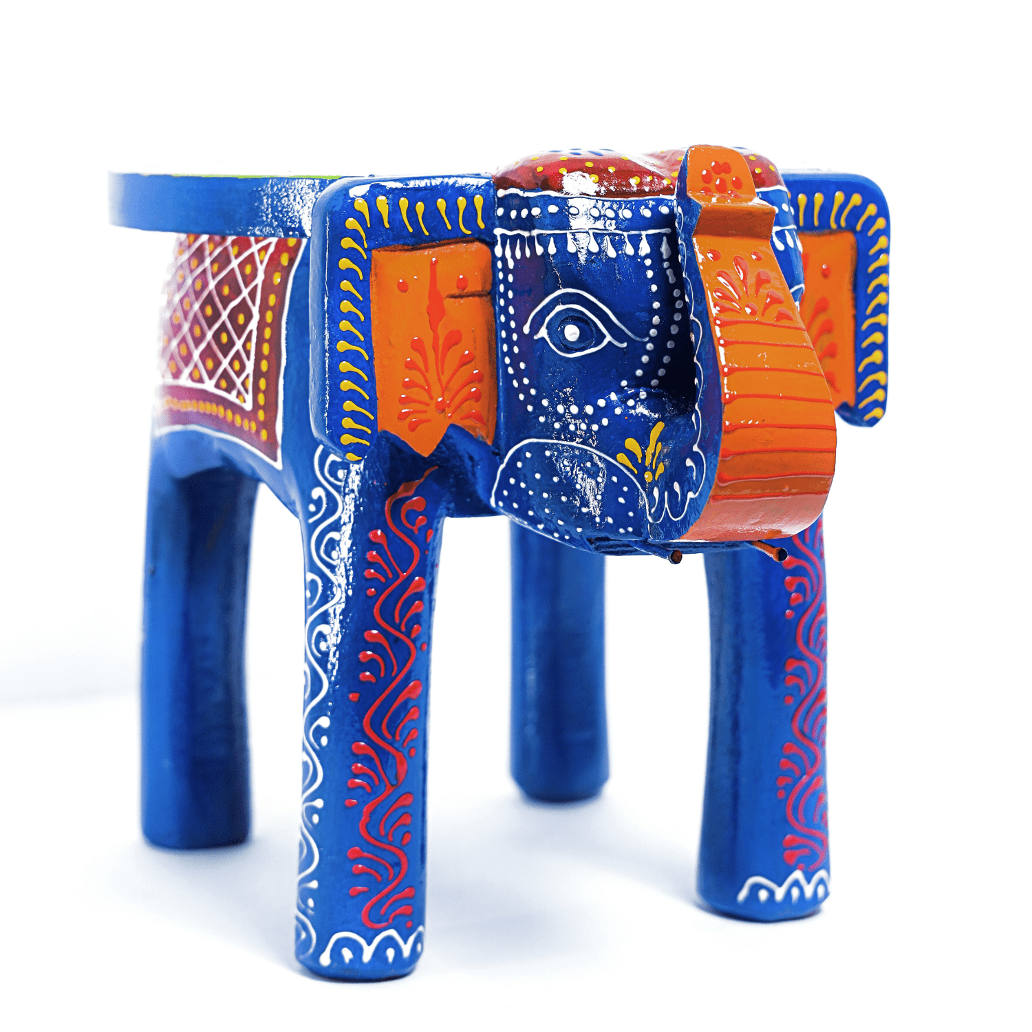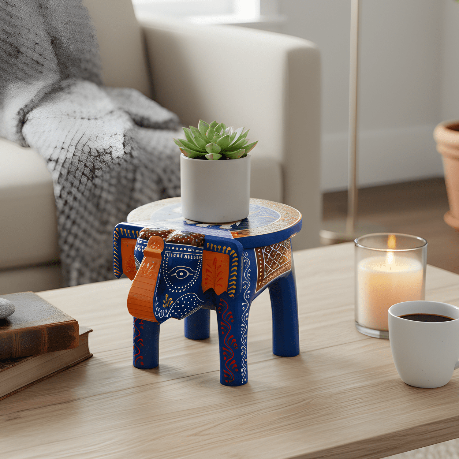 Illuminate Your Space with the HASTAM Handpainted Blue Rajasthani Elephant Stool! Introduce a piece of authentic Indian heritage and vibrant colour into your home with the HASTAM Handpainted Wooden Elephant Stool. This decorative table showcases the bold, joyful aesthetic of Rajasthani folk painting. THE BEAUTY OF BLUE AND TRADITION The stunning Blue colour sets this piece apart, serving as the perfect backdrop for the intricate, hand-painted multicolour motifs. Inspired by classic elephant designs and the rich cultural art of Rajasthan, this piece is more than decor—it’s a celebration of Indian artistic traditions. VERSATILITY IN A COMPACT SIZE At a convenient 8-inch size, this elephant stool is a highly functional accent. Use it to instantly refresh your decor as an accent table next to your bed, a unique plant holder in a sunny corner, or a colourful showpiece in your entryway. Its solid wood construction provides stability for its many uses. HANDMADE WITH CULTURAL PRIDE By choosing this stool, you support the legacy of skilled artisans. Every line and detail is meticulously handcrafted and painted, ensuring that no two pieces are exactly the same. The piece is lightweight yet durable, making it easy to integrate into any home or office decor scheme. SPECIFICATIONS: Brand: HASTAM Product: Wooden Elephant Stool / Decorative Table Height: 8 Inches (20 cm) Colour: Blue and Multicolour Style: Rajasthani Painting, Indian Traditional Usage: Decorative Showpiece, Plant Stand, Side Table, Gift Care: Wipe clean with a soft, dry cloth.