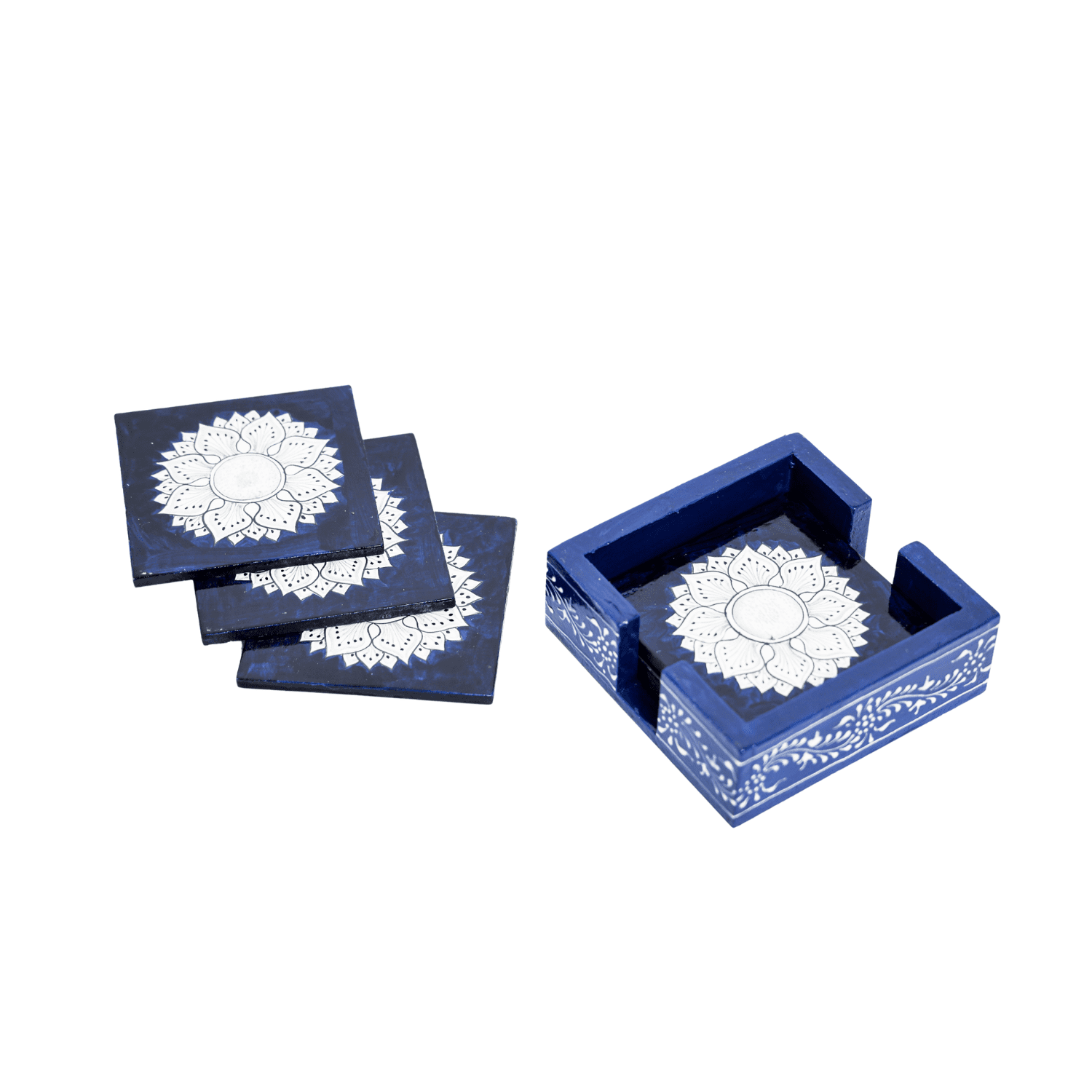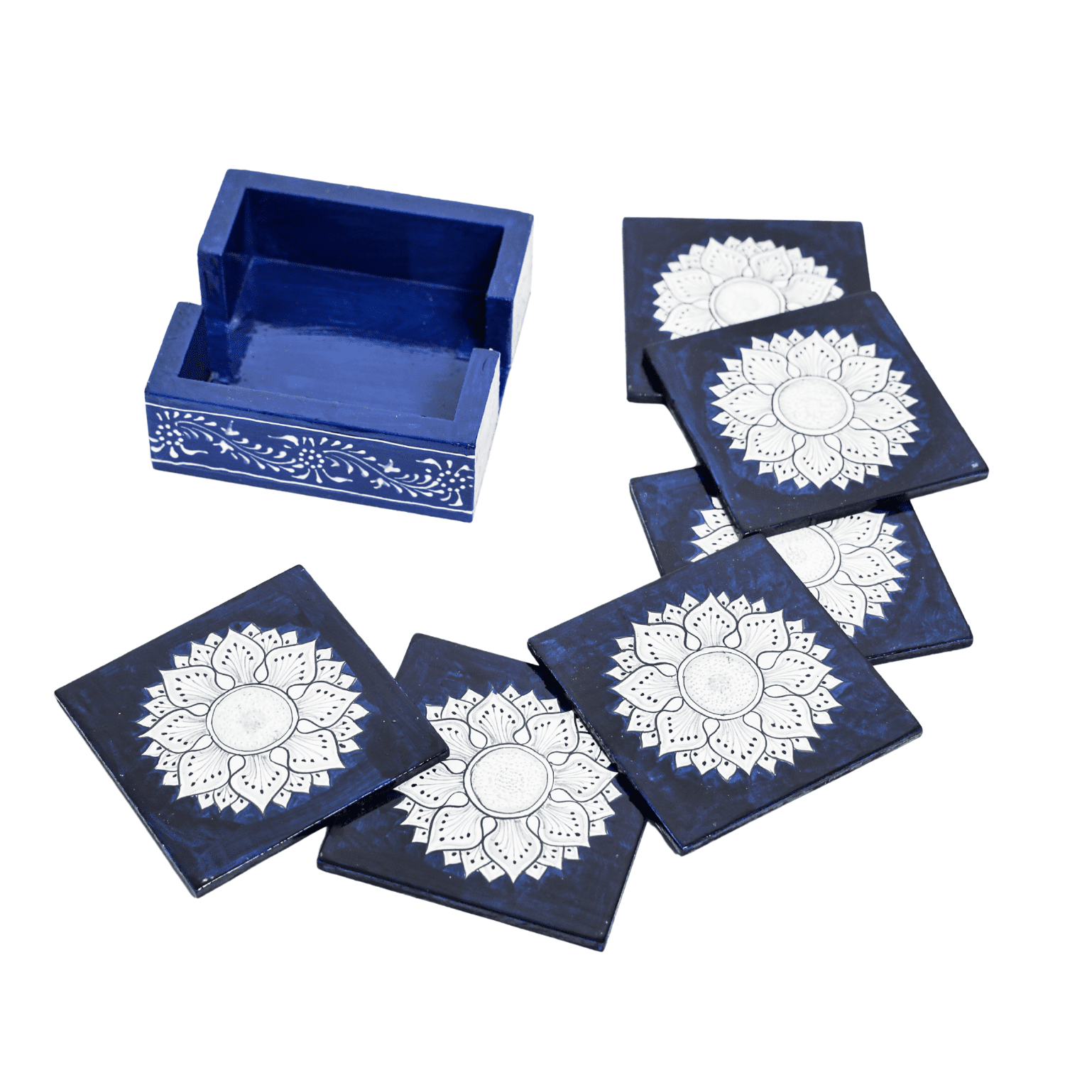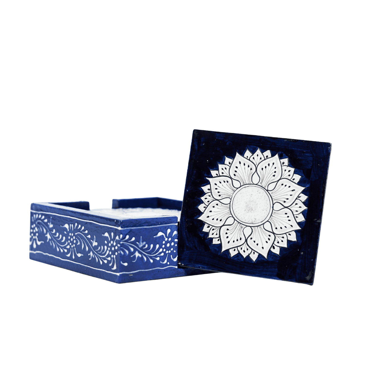 Add elegance and charm to your table with the HASTAM Handmade Wooden Coaster Set (Set of 6) featuring a stunning navy blue base with white floral mandala designs. Each coaster is carefully hand-painted by skilled artisans, showcasing the beauty of traditional Indian craftsmanship in a modern color palette. The square-shaped coasters offer full protection for your furniture from heat, moisture, and scratches while adding a decorative accent to your space. Paired with a coordinating wooden holder, they’re both functional and stylish — perfect for your tea table, dining area, or office desk. Whether you’re serving guests or decorating your home, this HASTAM Mandala Coaster Set makes a beautiful and practical addition — or a meaningful gift for any special occasion.