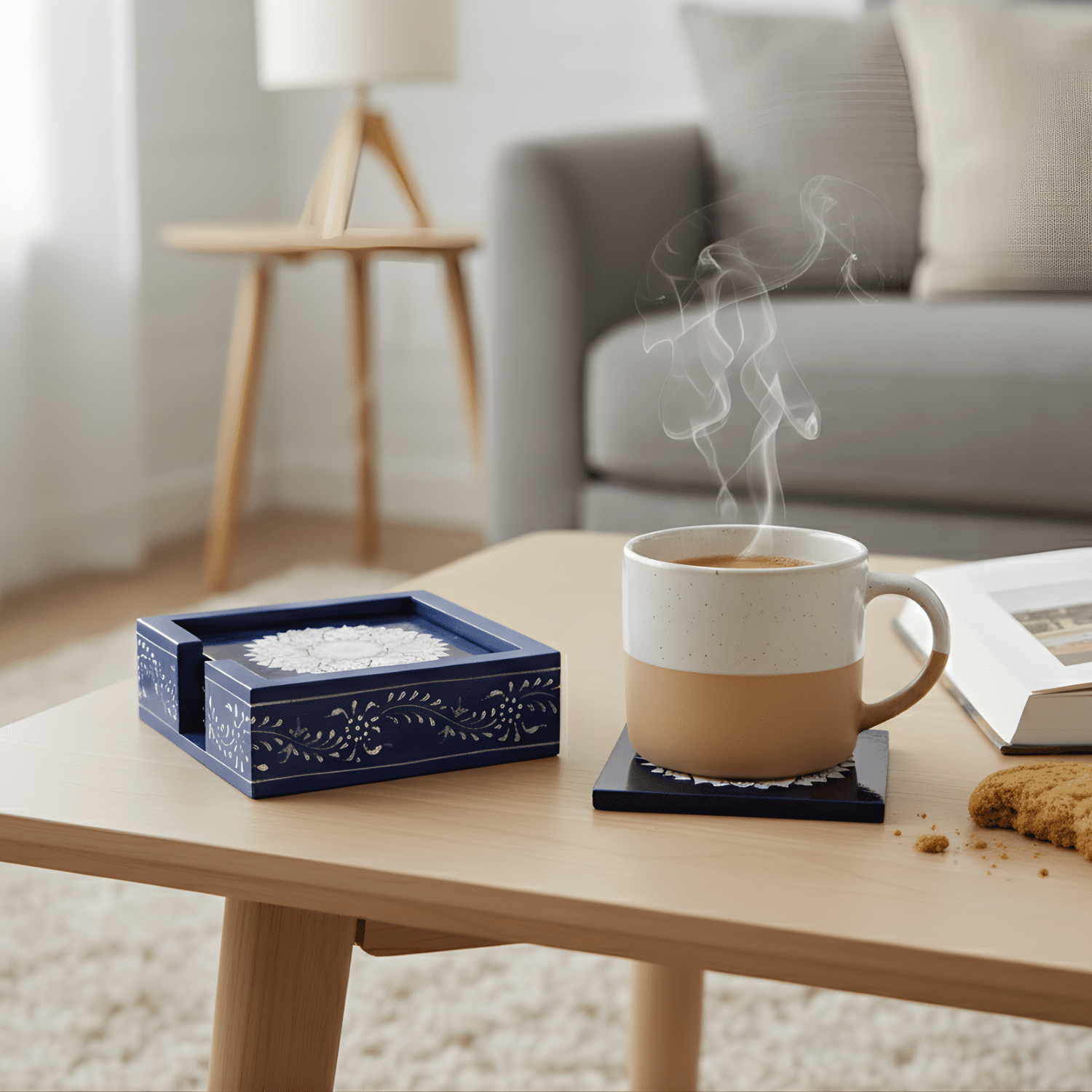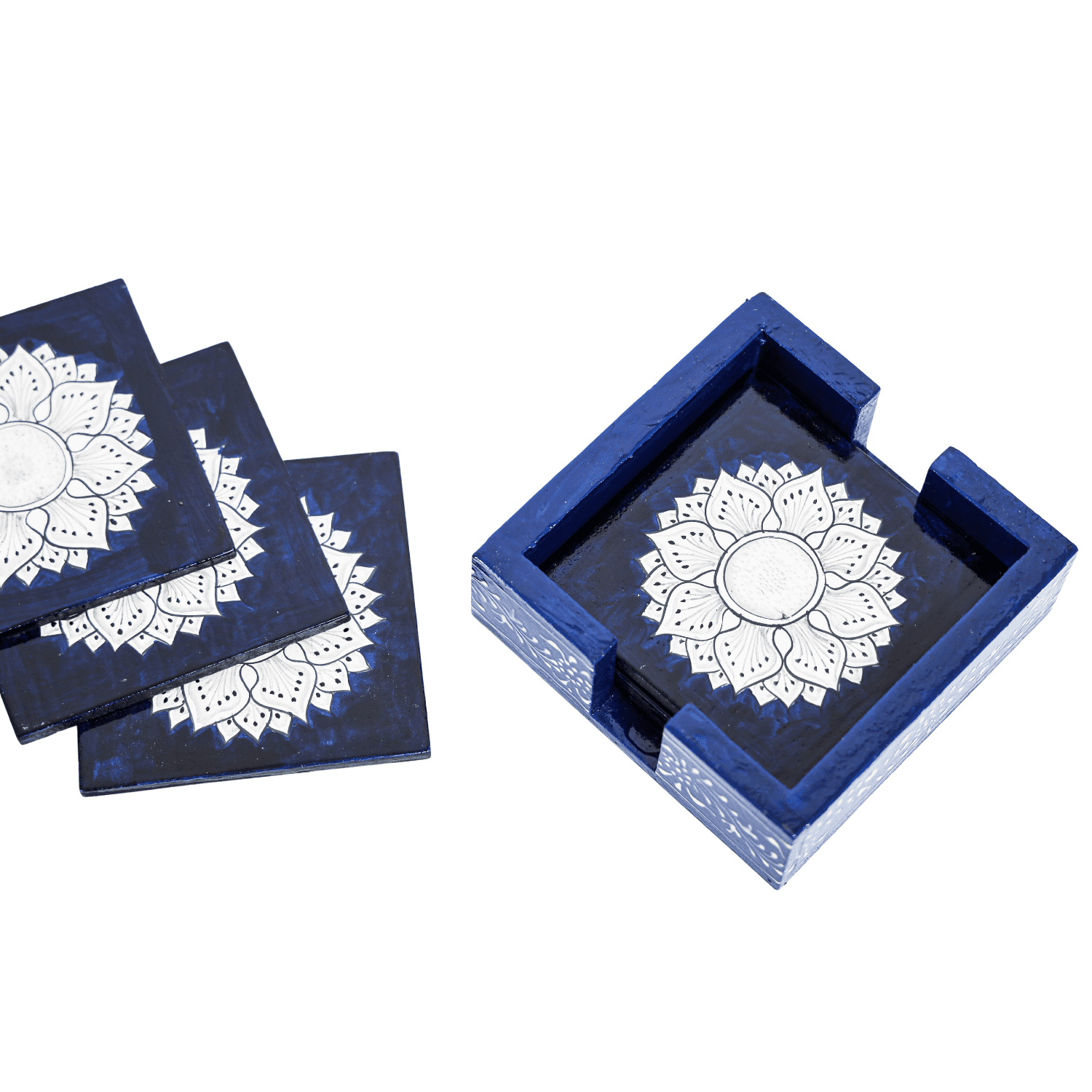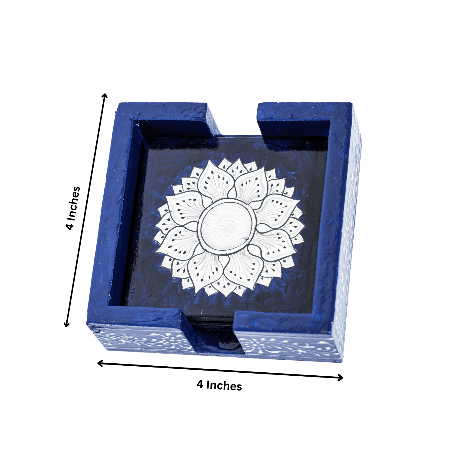 Add elegance and charm to your table with the HASTAM Handmade Wooden Coaster Set (Set of 6) featuring a stunning navy blue base with white floral mandala designs. Each coaster is carefully hand-painted by skilled artisans, showcasing the beauty of traditional Indian craftsmanship in a modern color palette. The square-shaped coasters offer full protection for your furniture from heat, moisture, and scratches while adding a decorative accent to your space. Paired with a coordinating wooden holder, they’re both functional and stylish — perfect for your tea table, dining area, or office desk. Whether you’re serving guests or decorating your home, this HASTAM Mandala Coaster Set makes a beautiful and practical addition — or a meaningful gift for any special occasion.