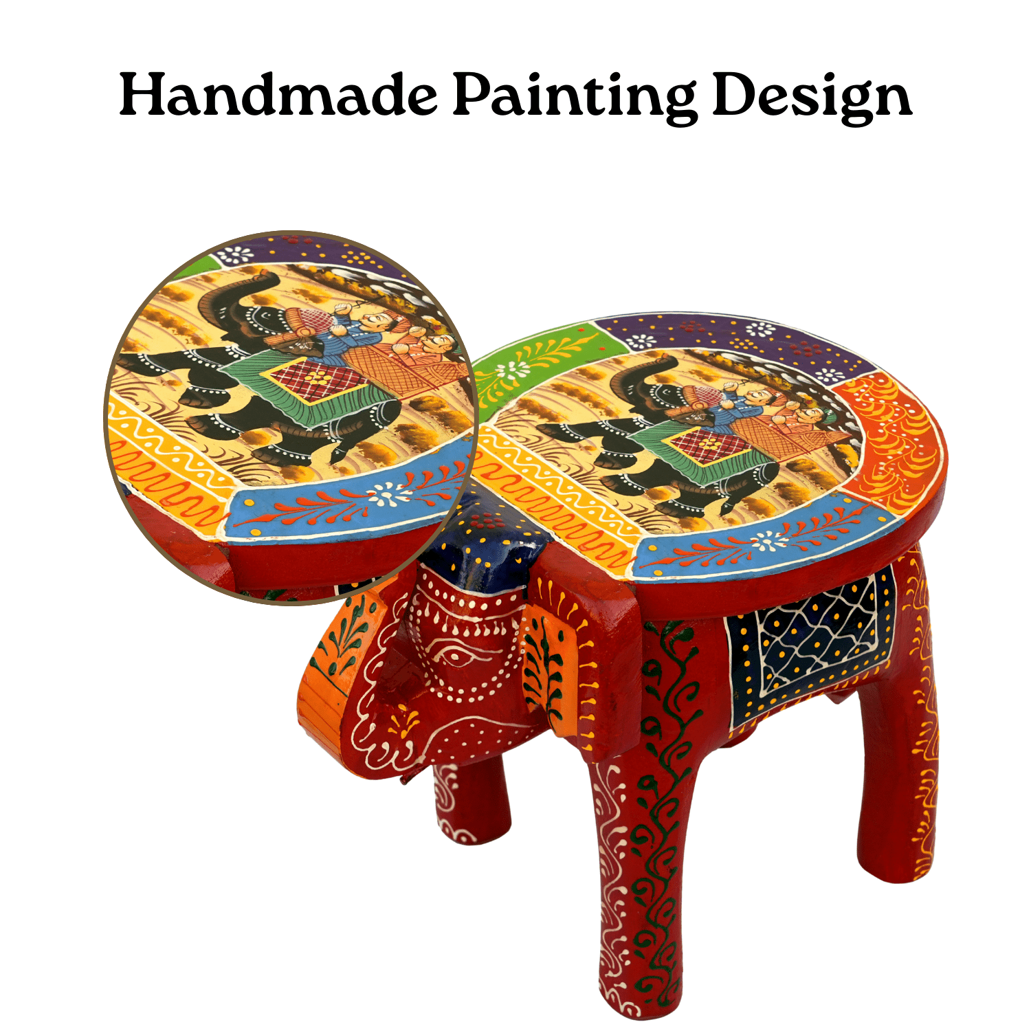 Each piece is 100% handmade, making it unique in color detailing and brushwork. The round top features traditional artwork, while the elephant design symbolizes strength, wisdom, and good luck, making it ideal for vastu-friendly décor.
